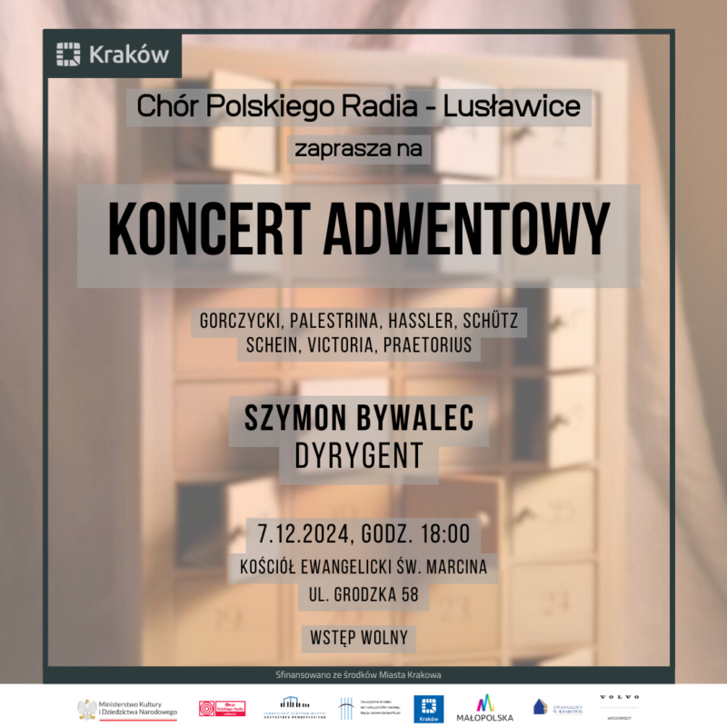 Utwory dawnych mistrzów: Palestriny, Schütza, Scheina, Praetoriusa, Hasslera, Victorii i Gorczyckiego wypełnią Kościół Ewangelicki Świętego Marcina w Krakowie przy ulicy Grodzkiej 58. Będziemy przed Państwem otwierać kolejne kieszonki muzycznego kalendarza adwentowego, aby umilić czas oczekiwania.